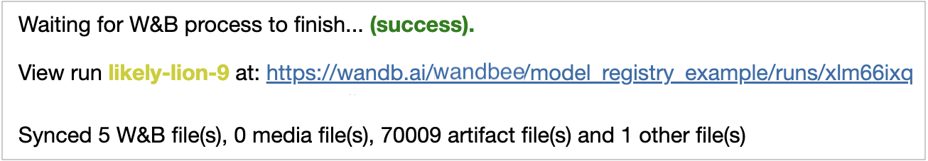 前述の例では、W&Bはlikely-lion-9というrun名とxlm66ixqというrun IDを生成します。likely-lion-9runはmodel_registry_exampleというプロジェクトに保存されます。